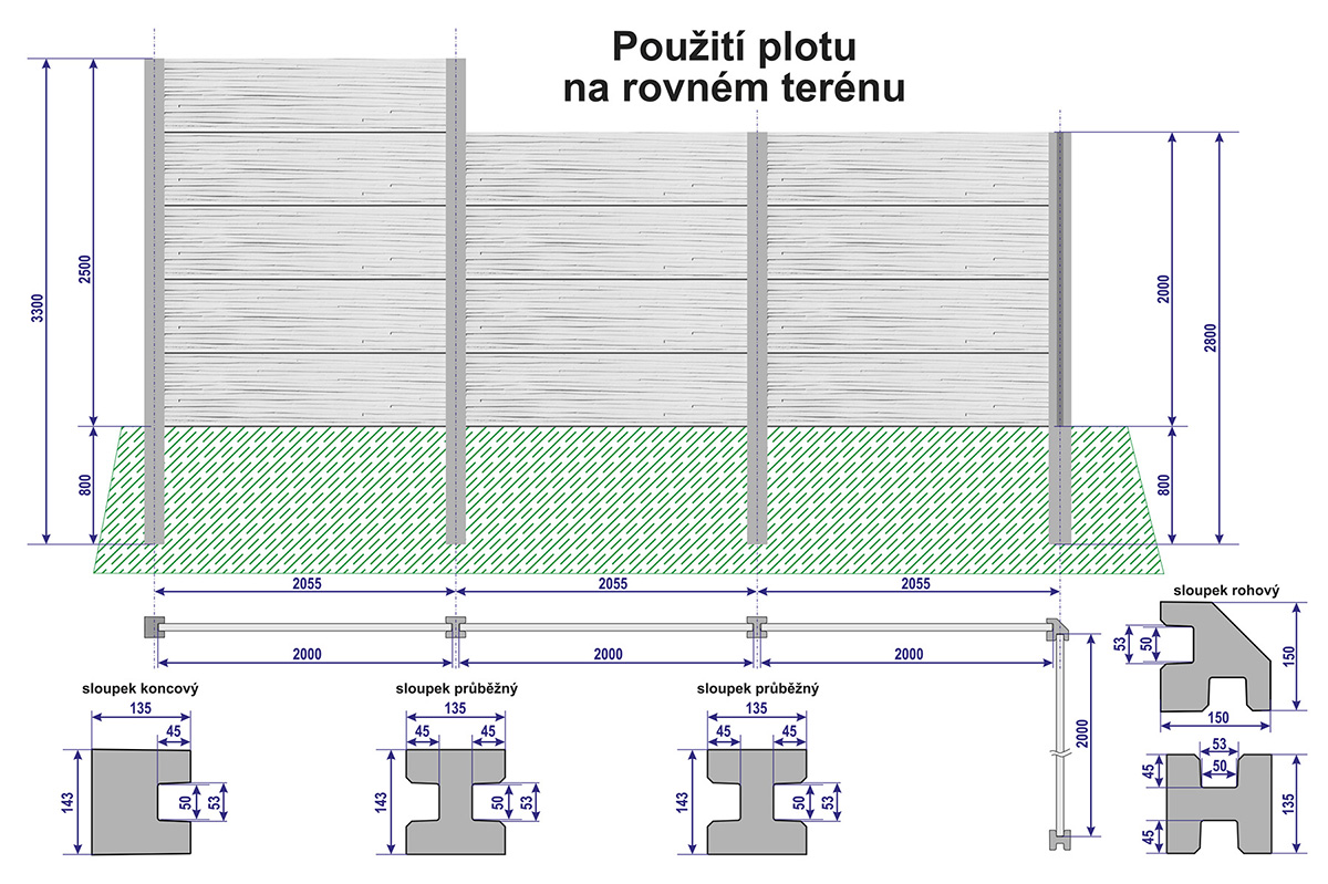Plotové desky dodáváme ve výšce 500 mm i 250 mm. Plotové sloupky jsou standardně dodány jako koncové, průběžné a rohové dle umístění sloupků v plotu. Plotové sloupky jsou pak dodávány pro výšku plotu od 1 až do 3 metrů po 250 mm.