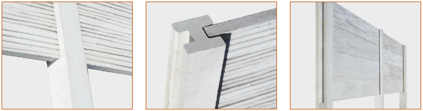 Betonový plot BSG se skládá z průběžných, rohových a koncových sloupků a betonových pohledových desek. Ty se zasunují do drážek v betonovém sloupku.