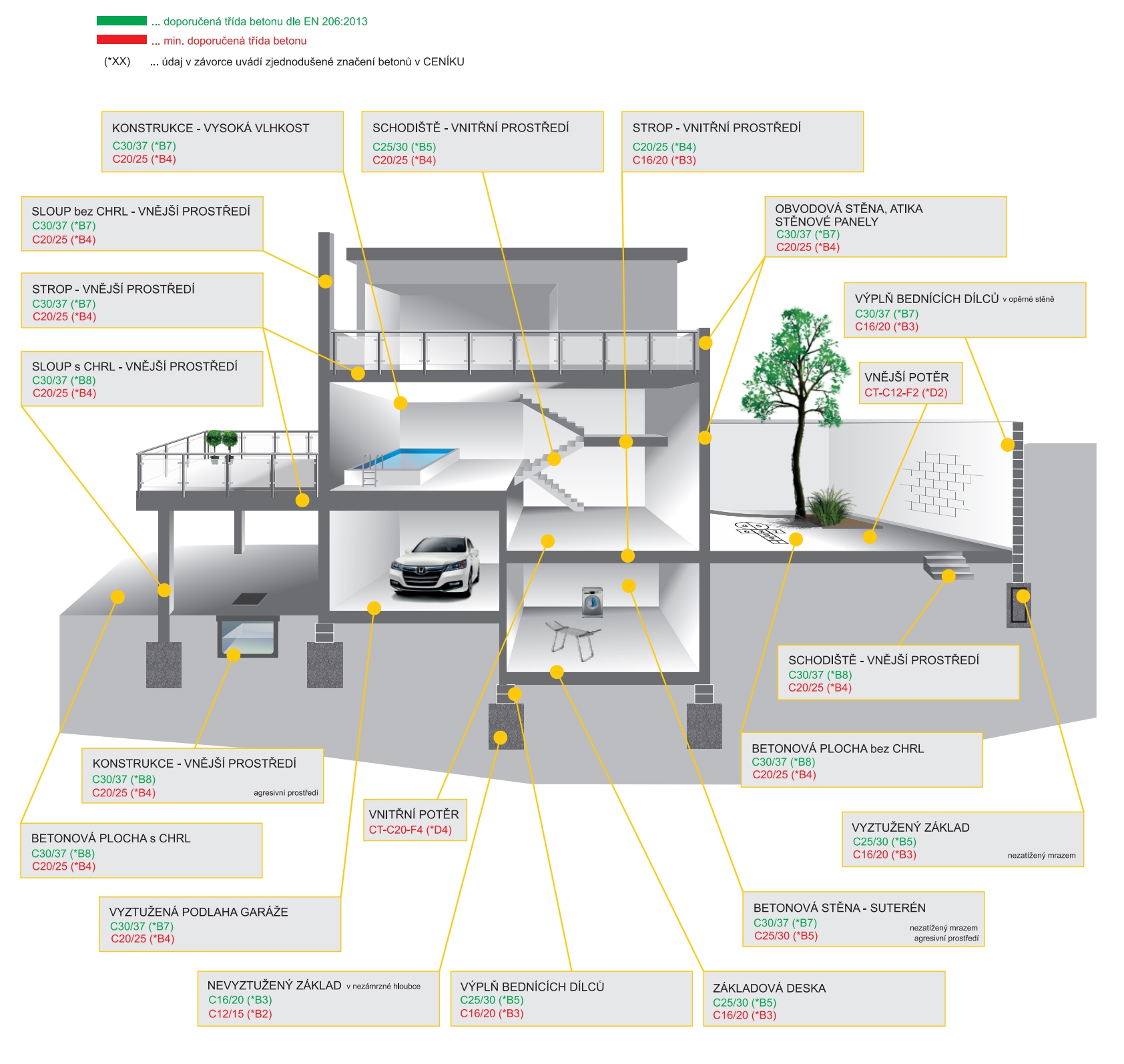 Přehled doporučených a minimálních tříd betonu dle jeho použití.